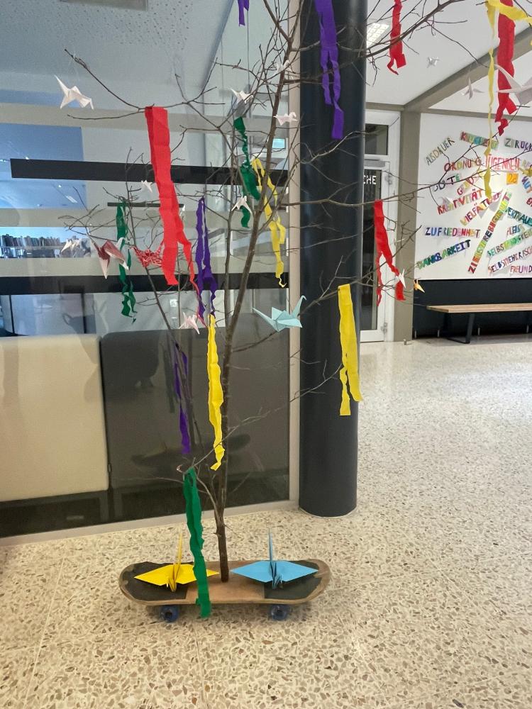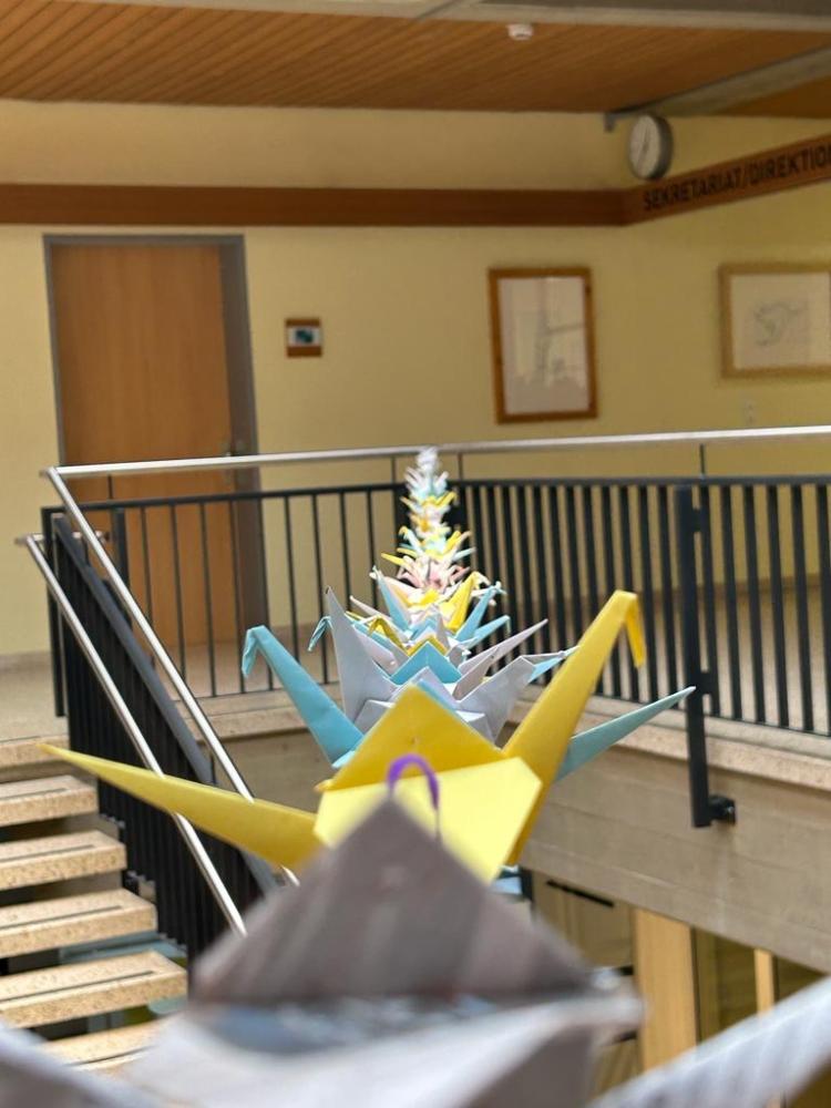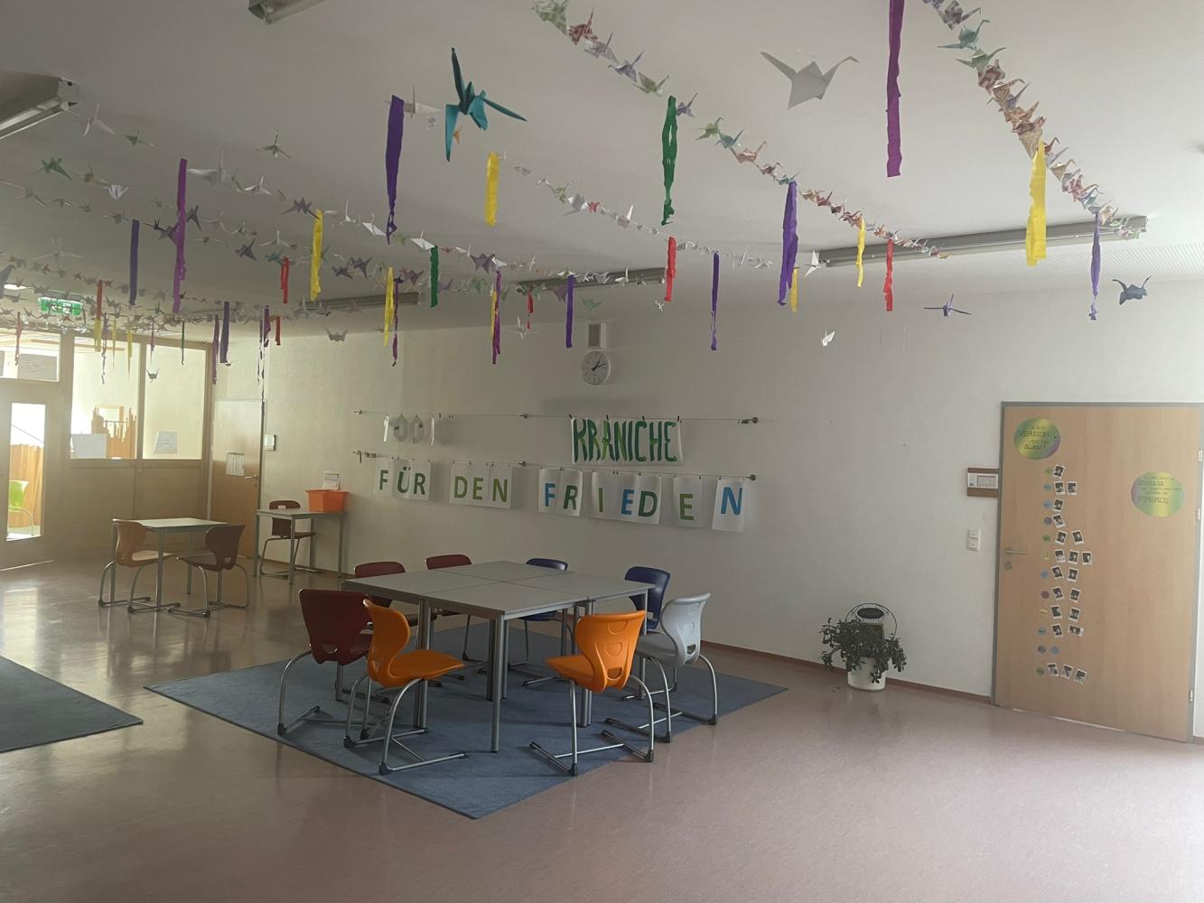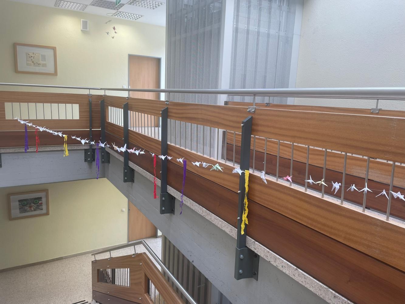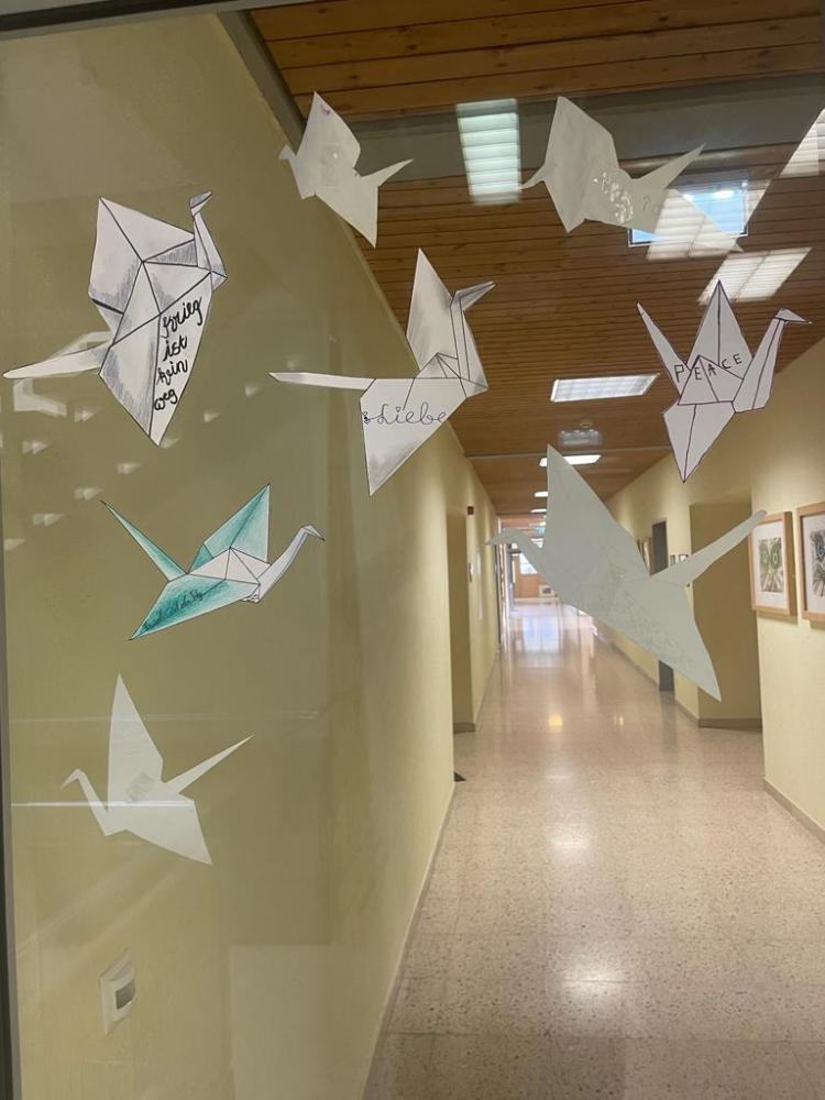 Das Buch erzählt die Lebensgeschichte eines 12-jährigen Mädchens aus Japan, welches nach dem Abwurf der Atombombe erkrankte. Sadako faltete 1000 Kraniche, um wieder gesund zu werden. Später wird das Falten von Kranichen ein Symbol des Friedens. Wir, an unserer Schule, falten nun 1000 Kraniche und wünschen uns Frieden auf der Erde. Aktuell haben wir auch einige Kinder aus der Ukraine bei uns - wir wollen ein Zeichen setzen. Friede fängt in jedem von uns an.