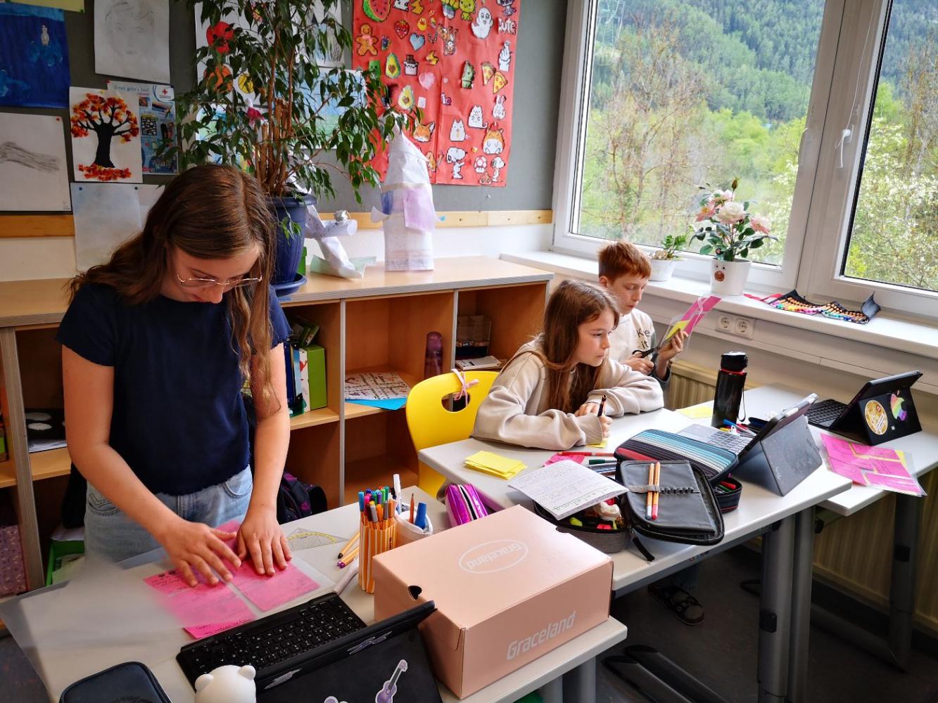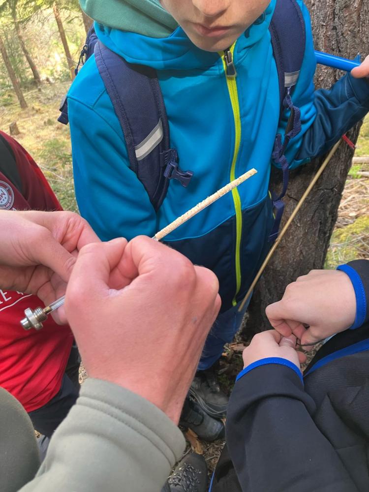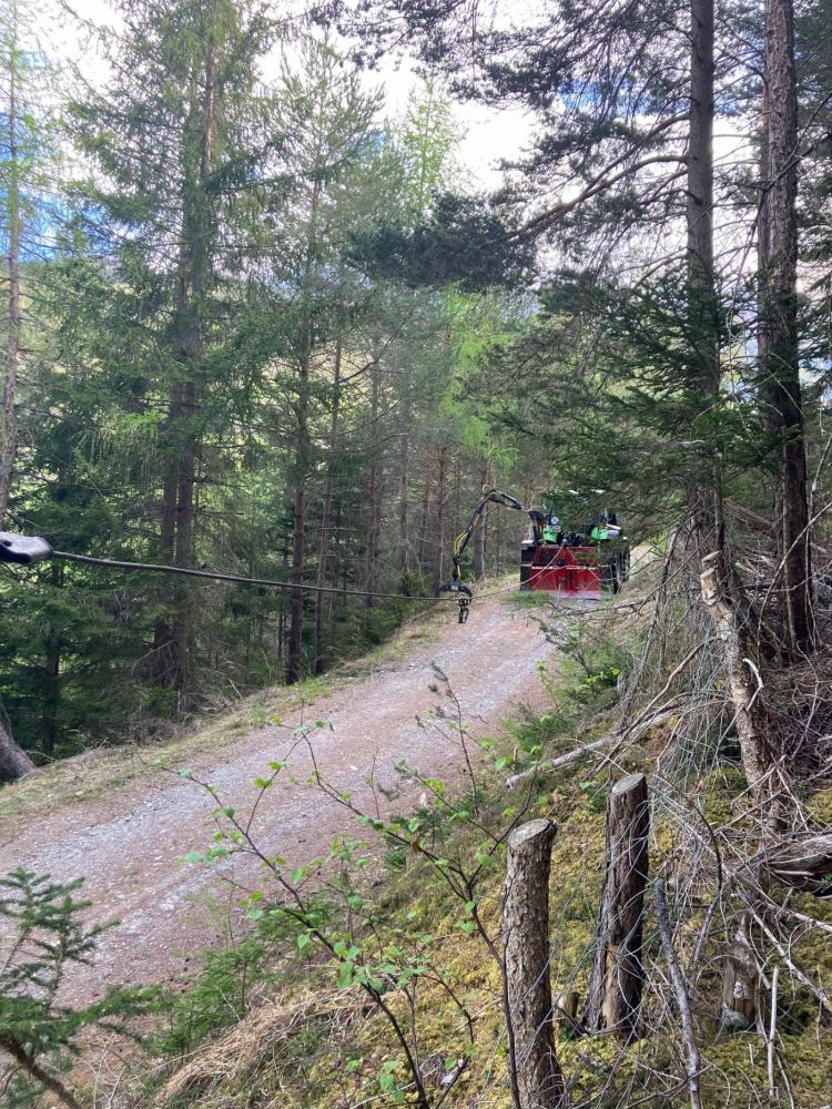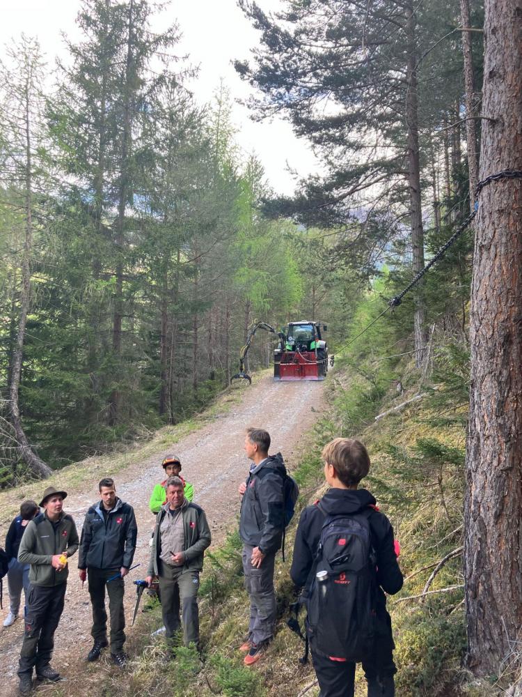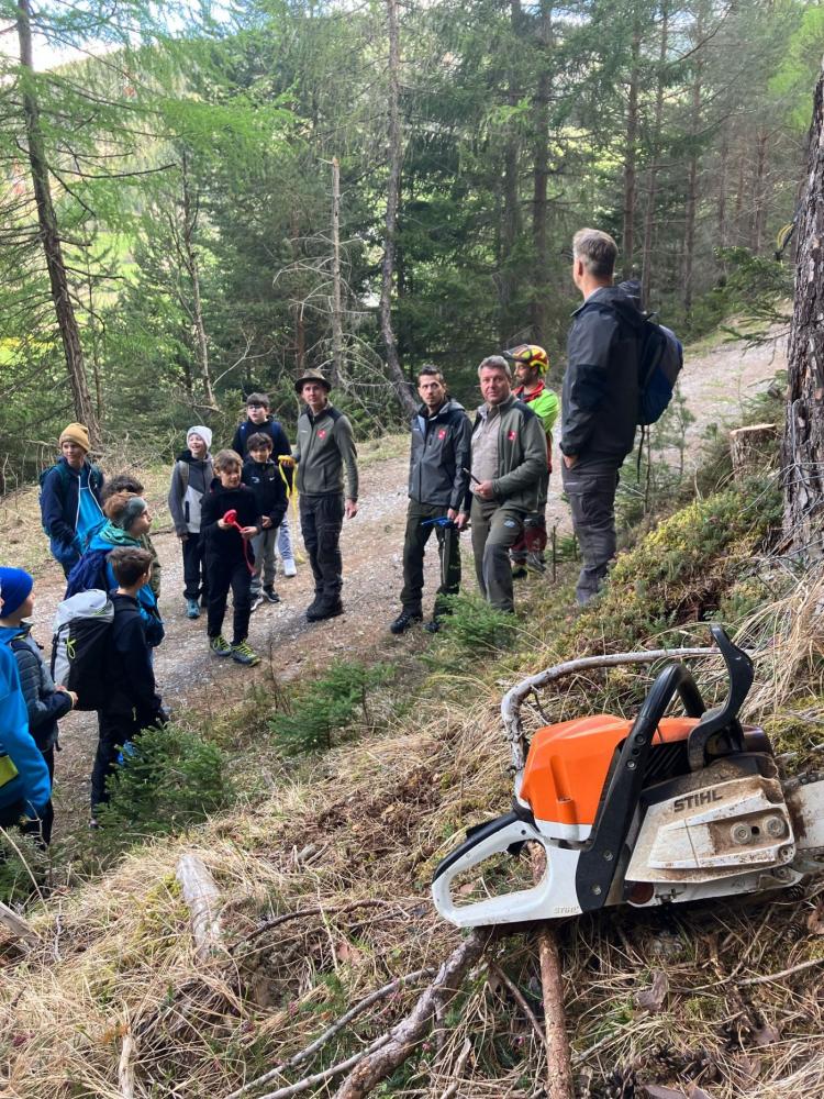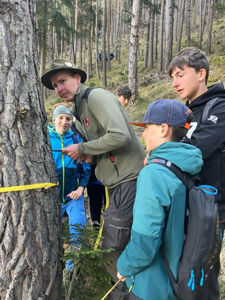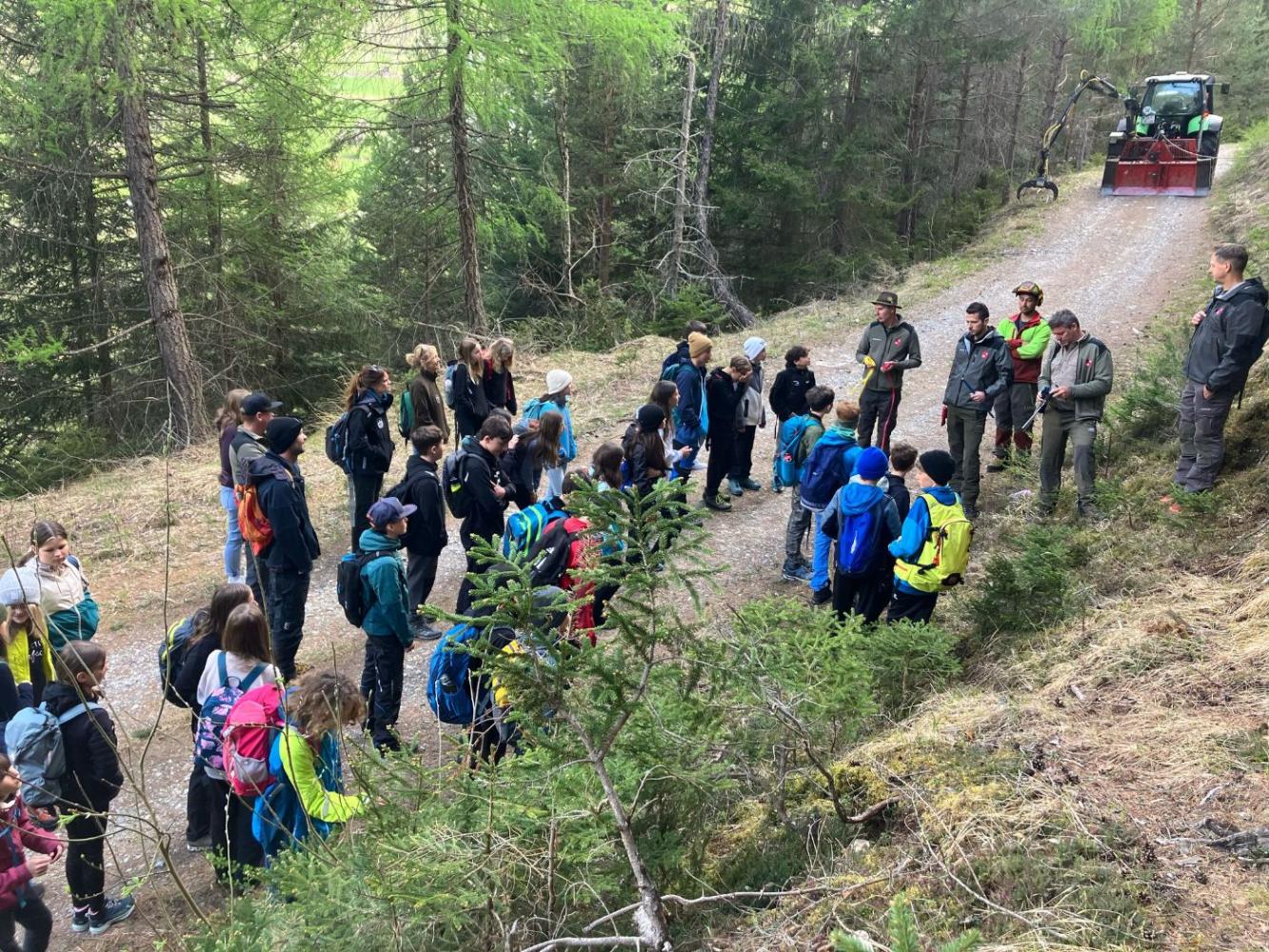 Gleich zwei Tage verbrachten die Schülerinnen und Schüler im Freien: Einmal ging es von der Schule aus zu Fuß in den Wald unterhalb von Fendels, begleitet von Waldaufsehern unserer Region. Sie erklärten den Kindern die verschiedenen Baumarten, Spuren von Tieren und die Bedeutung des Waldes für das Ökosystem. Auch faszinierende Einblicke in die Forstarbeit wurden ermöglicht: So wurde beispielsweise direkt vor Ort ein Baum gefällt und mittels Forsttraktor und Seilwinde aus dem Wald gezogen. Die SchülerInnen staunten auch über hochmodernes Equipment der Förster und Waldaufseher, als ihnen gezeigt wurde, wie man mittels Drohne von oben die von Käfer befallenen Bäume erkennen kann.