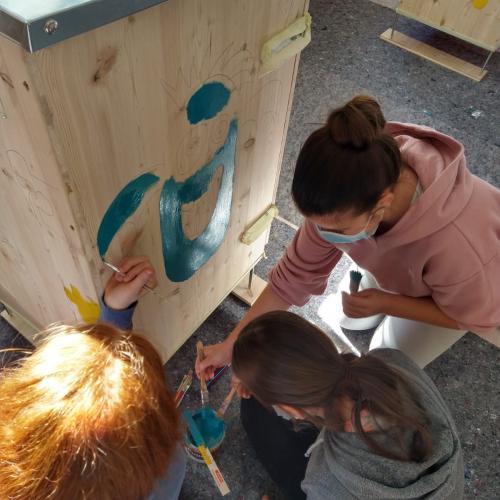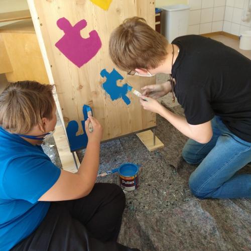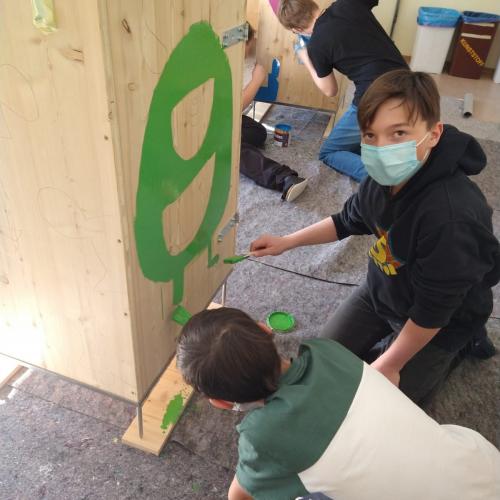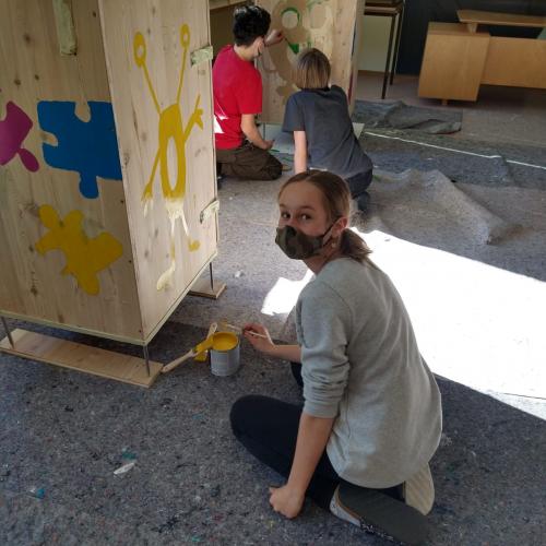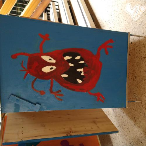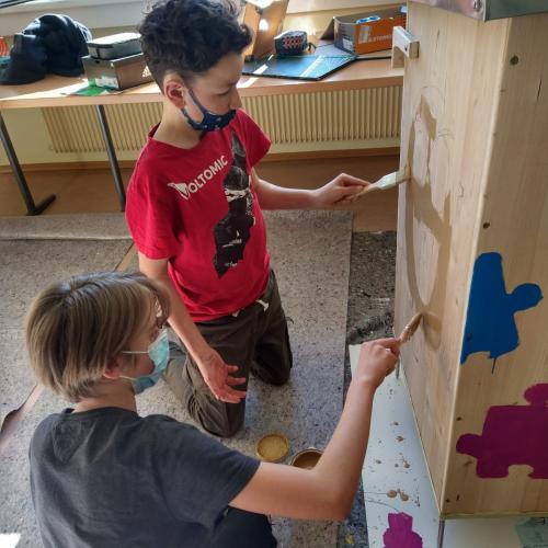 Unser Schulwart Erwin hatte die Idee, die schwarzen Mülleimer im Schulgelände, mit einer Holzeinfassung zu verkleiden. Die 3c-Klasse und das Team der Neigungsgruppe Darstellendes Spiel bemalten die neuen „Müllgaragen“ mit bunten Motiven: Müllmonster, Puzzleteile, Landschaften und noch andere Ideen kann man jetzt im freien Gelände unserer Schule bewundern.