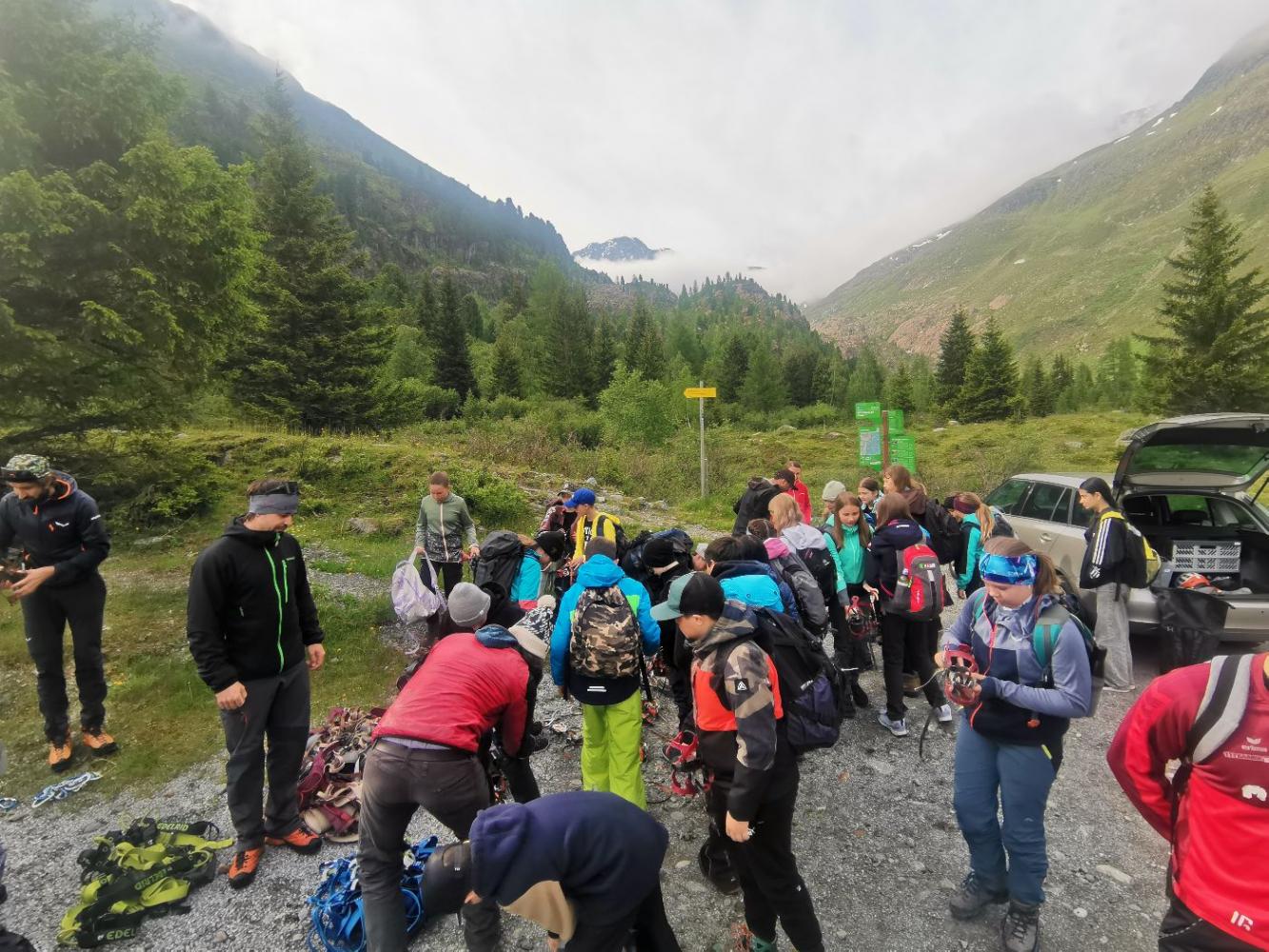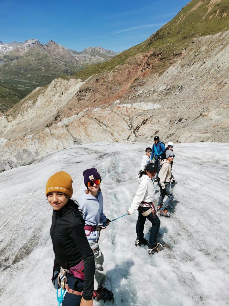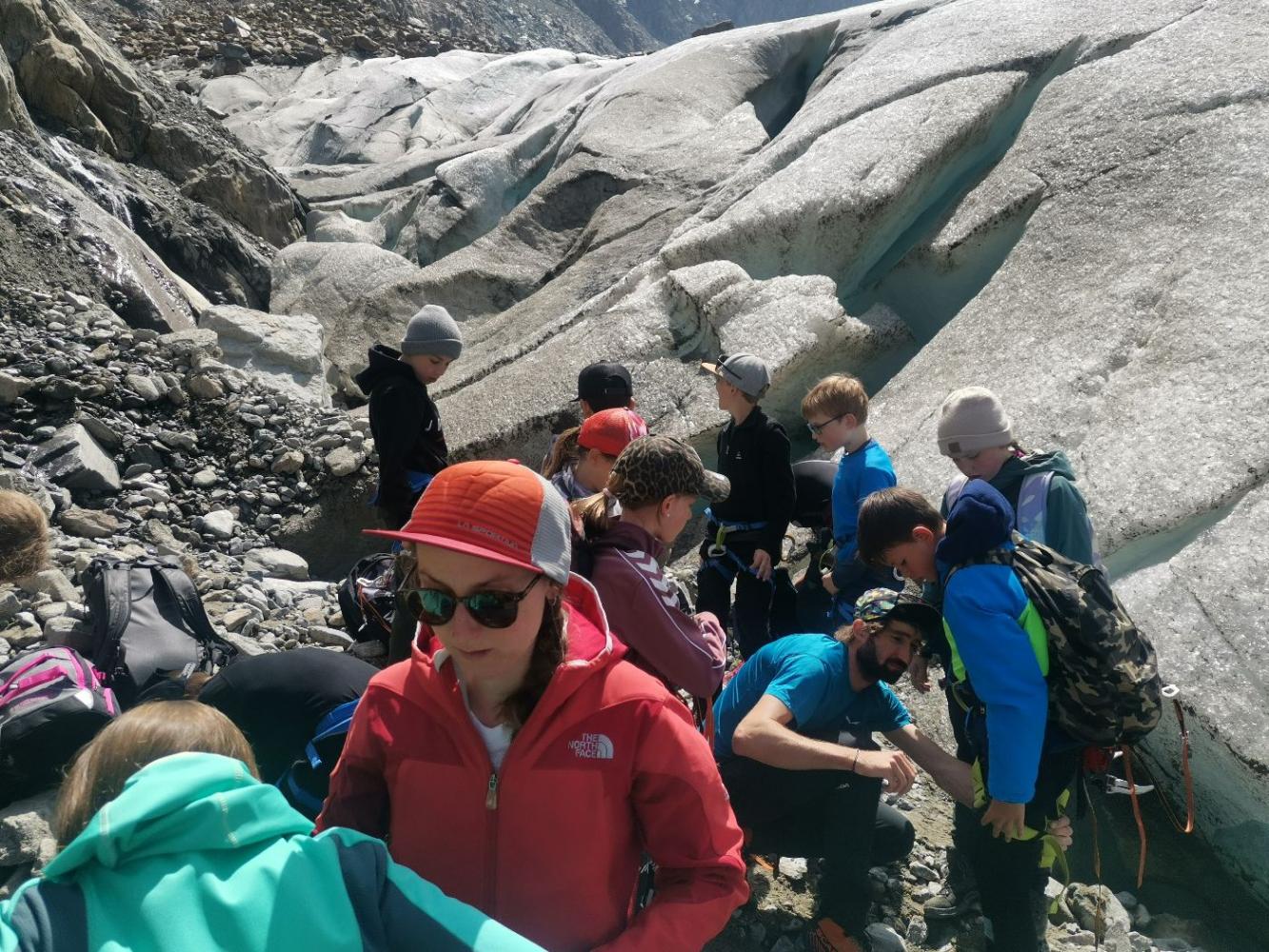 Die Tage zuvor wurde in der Schule das Thema „Gletscher“ theoretisch durch einen Stationenbetrieb erarbeitet. Aber nichts ist besser als praktisches Erleben. Den Gletscher sehen, spüren und angreifen zu können. Dank der Bergführer fühlten wir uns stets wohl und wurden auch dementsprechend ausgestattet. Kurz vor der Gletscherzunge wurde der Klettergurt übergezogen und die Steigeisen befestigt. In verschiedenen Kleingruppen wurden dann die Gletscherspalten überwunden und die Natur richtig gespürt. Es war für alle Beteiligten ein super Erlebnis. Sowohl die SchülerInnen als auch die Lehrpersonen und Bergführer waren voller Begeisterung.