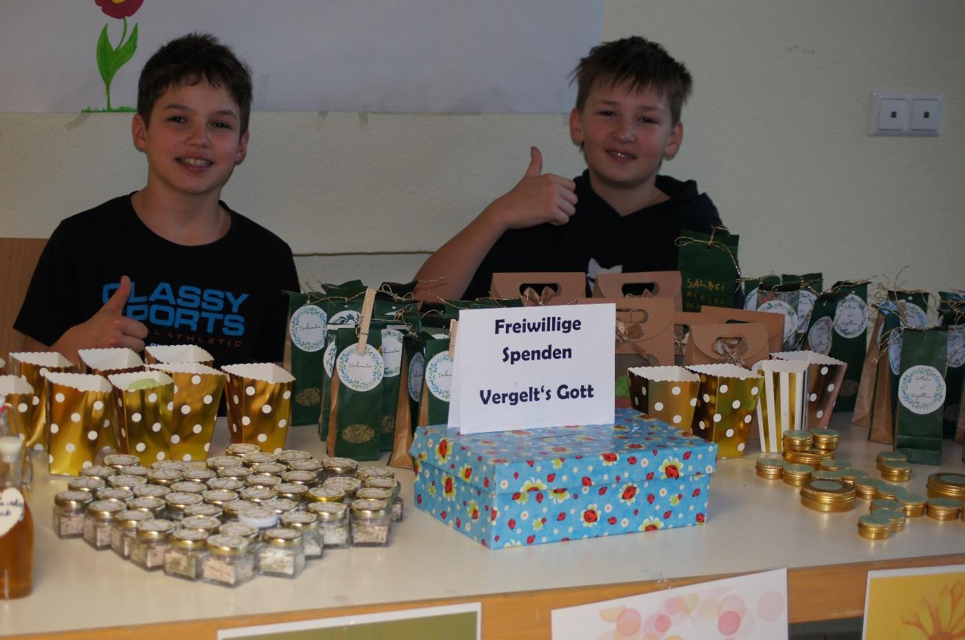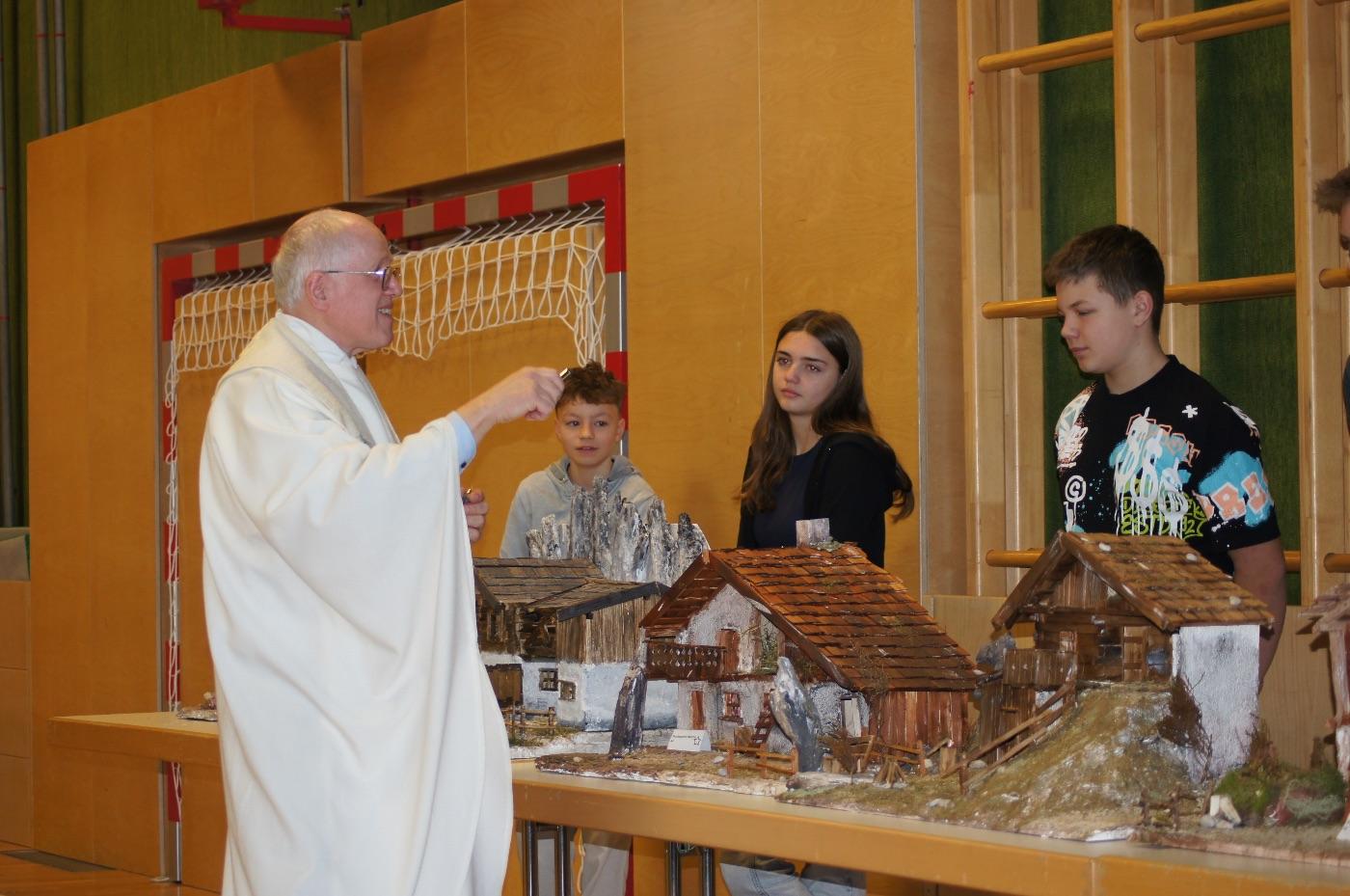 Am nächsten Tag kamen wir zur Schulmesse zusammen. Dabei segnete Dekan Hinterholz die Krippen, die die Kinder in wochenlanger Arbeit gebaut hatten. Ein besonderes Highlight für viele war der Weihnachtsbasar der Tu:es:day-Gruppe: Gegen eine freiwillige Spende wurden selbstgemachte Leckereien angeboten. Zwei Kinder aus der Neigung Kräutergarten bereicherten den Basar zusätzlich mit selbst hergestelltem Tee, Badebomben und Kräutersalz.