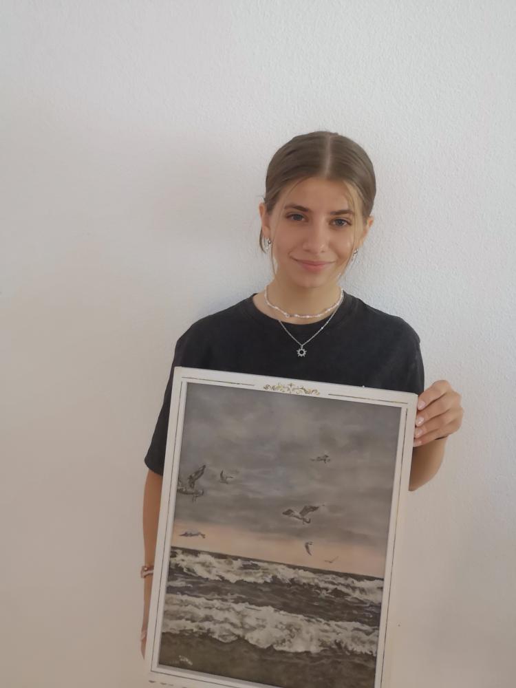 Die junge Ukrainerin besuchte mit ca. 7 Jahren in der Ukraine einen dreijährigen, intensiven Kunstkurs und vertiefte so schon sehr früh ihre Liebe zur Malerei. Heute malt sie am liebsten das Meer mit seinen sanften Wellen, inspiriert von den Erinnerungen an ihre Heimat. Ihre Lieblingsfarben sind Blau, Weiß und Grau und das Experimentiern mit Ölfarben auf Leinwänden macht ihr besonders viel Spaß. Für Freunde und Bekannte zeichnet sie gerne Portraits und verschenkt diese zu Geburtstagen oder anderen Anlässen.
