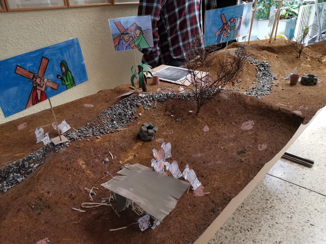 Die Schülerinnen und Schüler der 2a haben haben den „Schichtbetrieb“ im Unterricht wörtlich genommen und abwechselnd in Schichten an ihrem Osterweg gearbeitet.