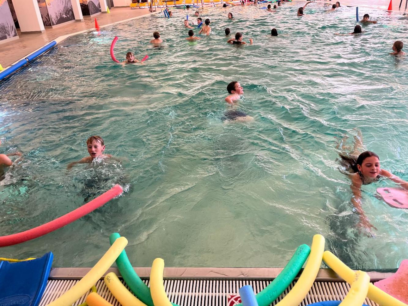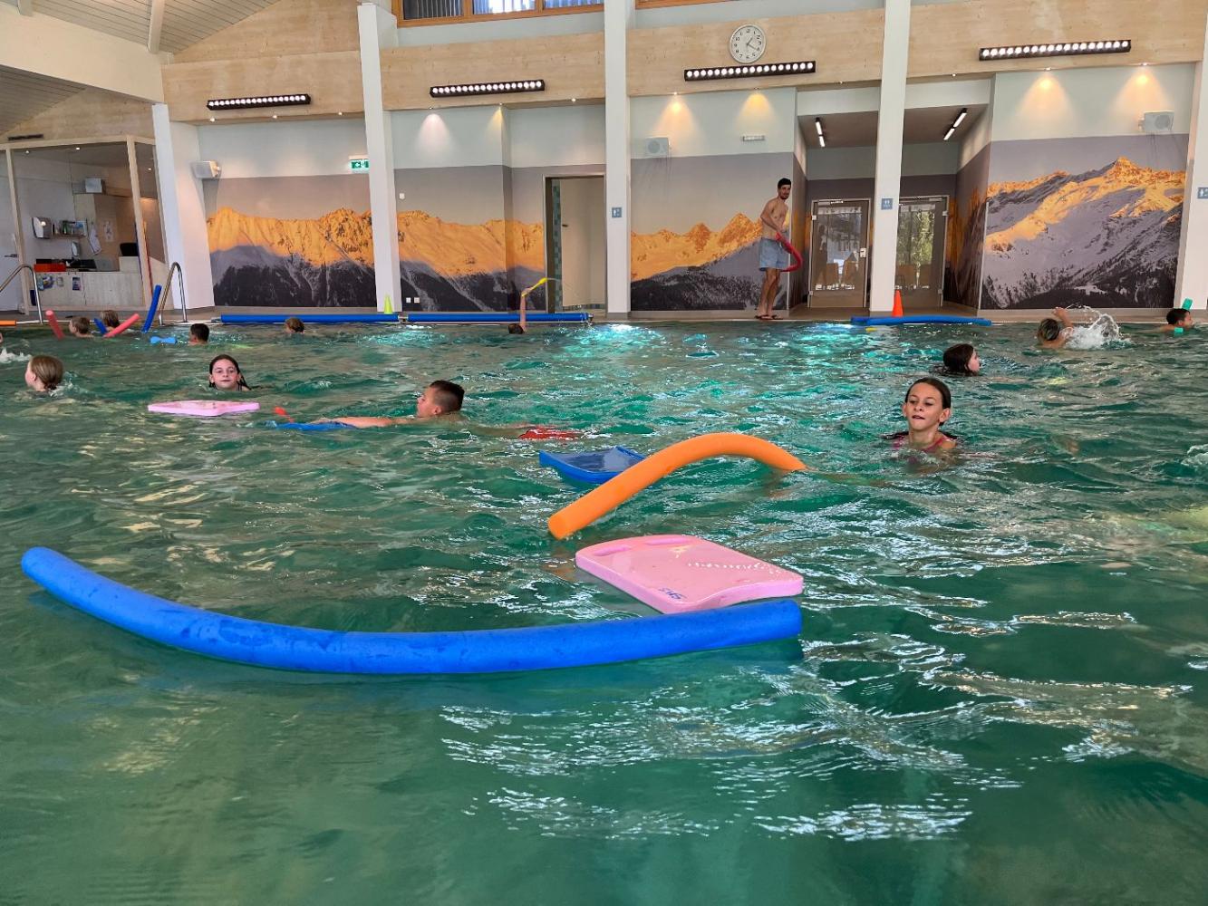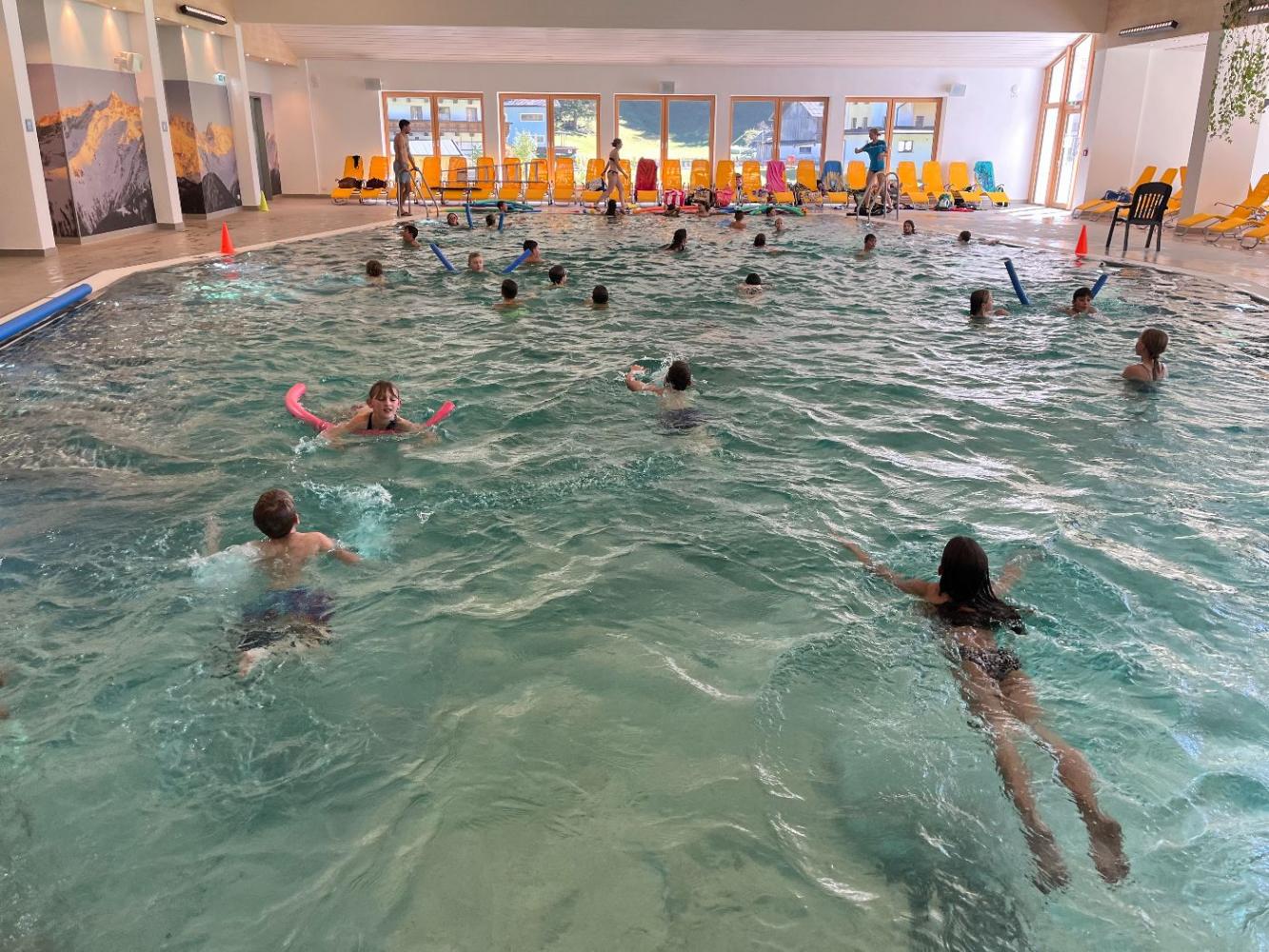 Die 1. Klassen verbrachten eine spannende Schwimmwoche im Schwimmbad Quellalpin Kaunertal. Die Schülerinnen und Schüler verbesserten ihre Schwimmtechniken, übten Tauchen und Rettungsübungen und hatten viel Spaß bei Spielen im Wasser.