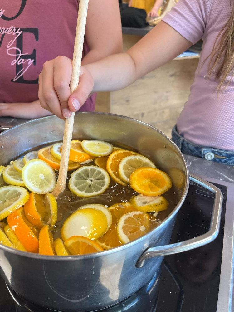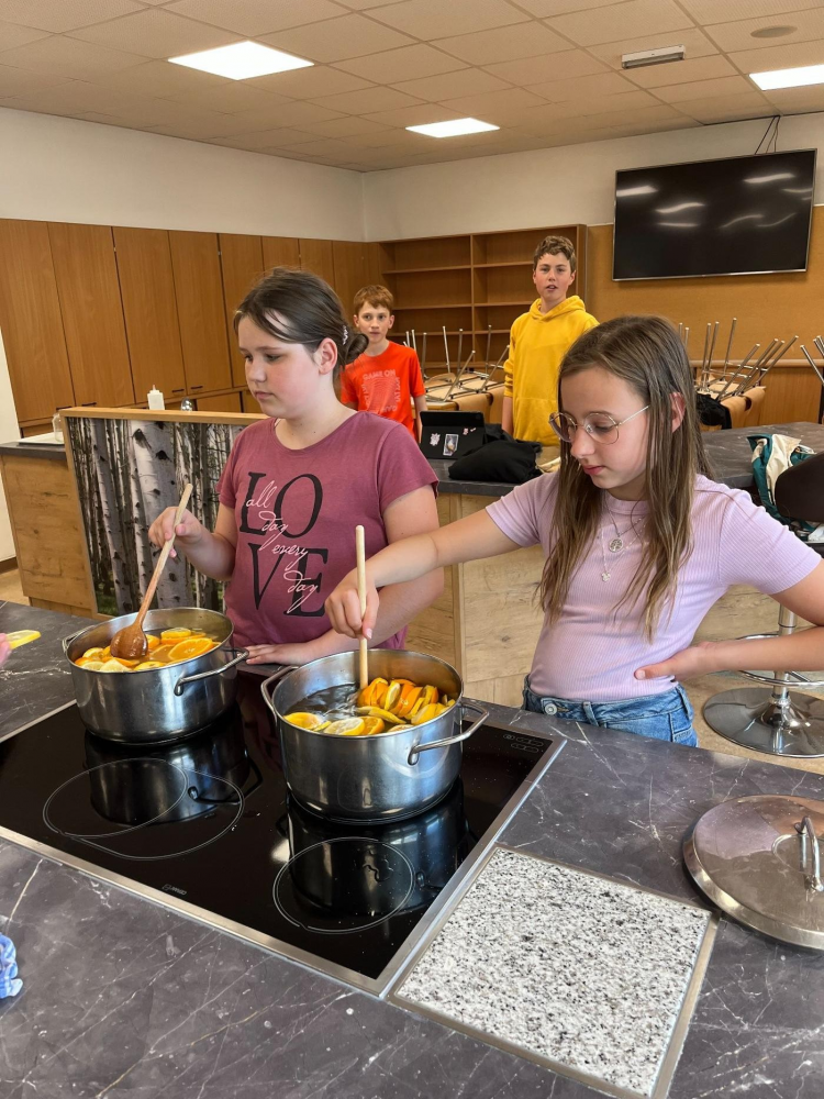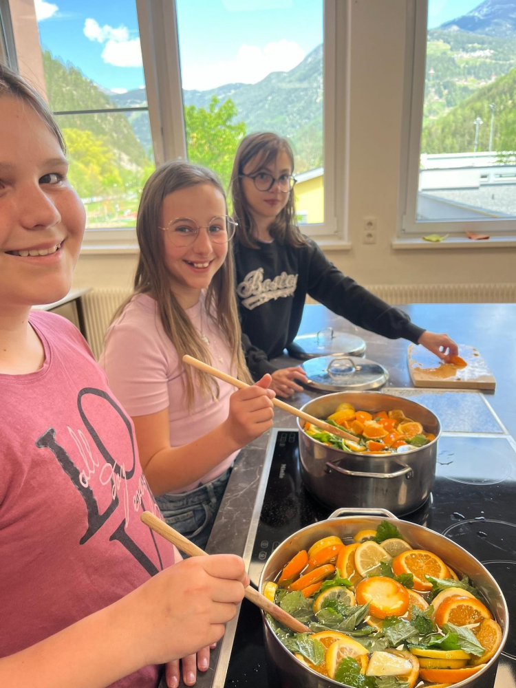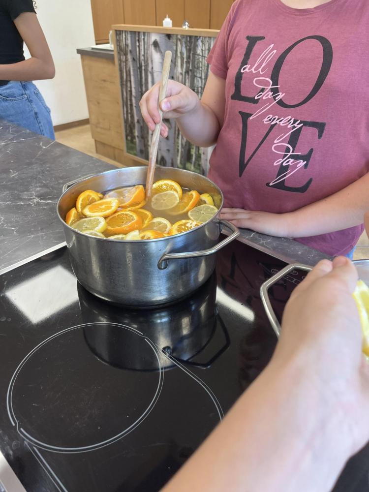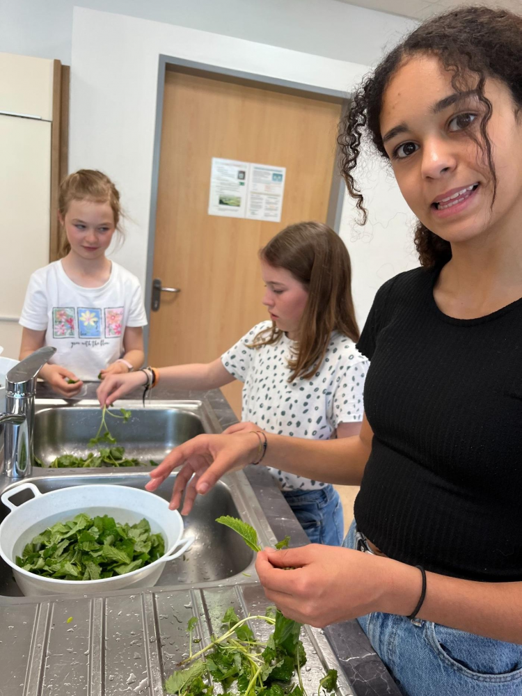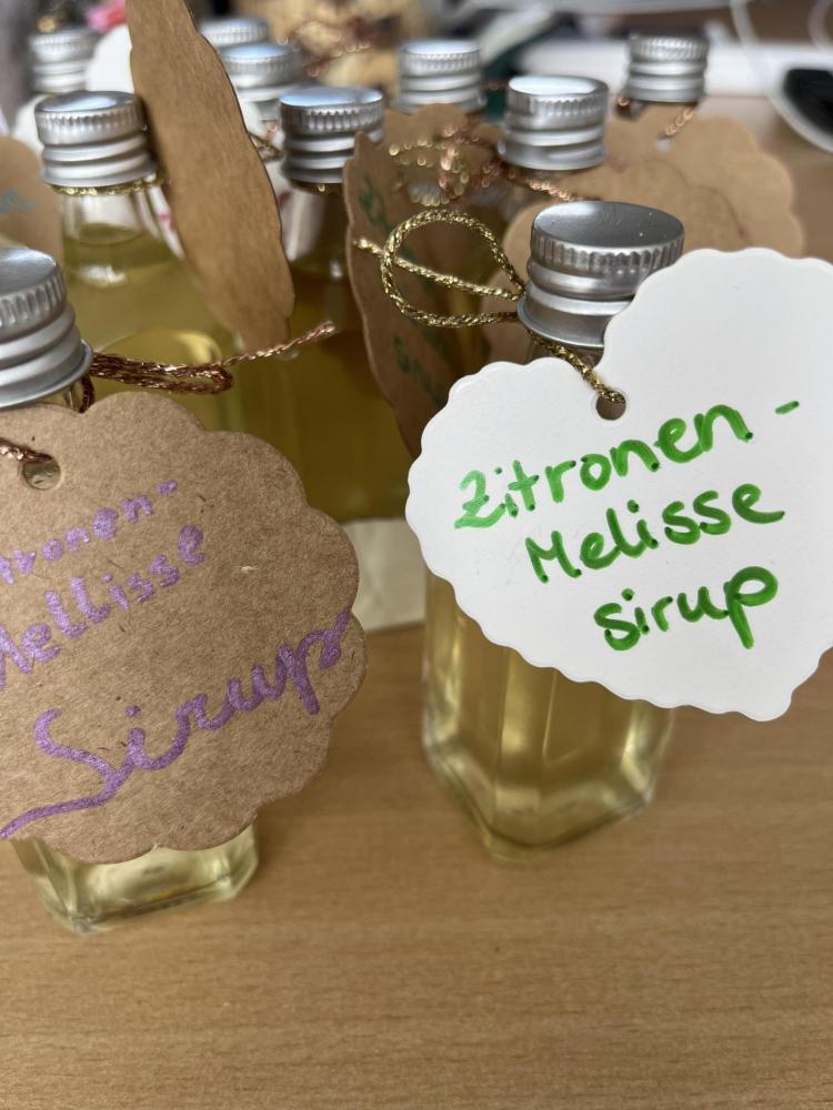 Wir haben bereits etwas aus unserem Kräuterschulgarten ernten können - köstliche Zitronenmelisse. Nach kurzer Nachfrage, was wir nun daraus zaubern sollen, haben die "Kräutergartler" sich für Sirup von der Zitronenmelisse entschieden.