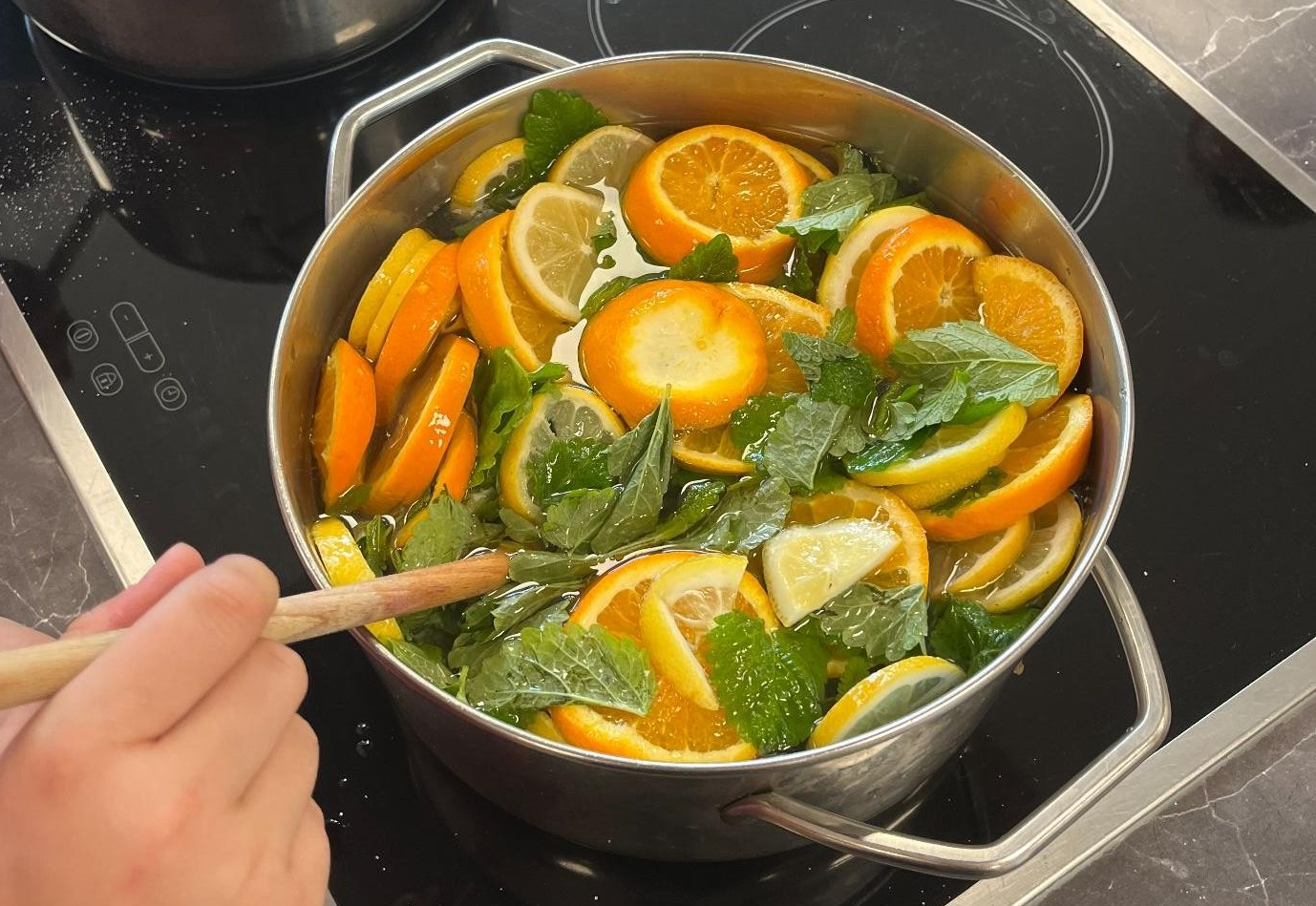 Die Zitronen heiß waschen, gut abtrocknen und in Scheiben schneiden. Gemeinsam mit der Zitronensäure ins Glas zur Zitronenmelisse geben und mit dem Wasser auffüllen.