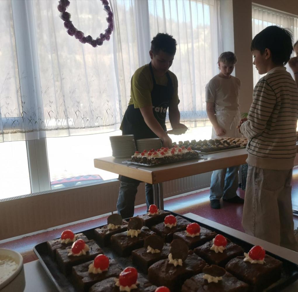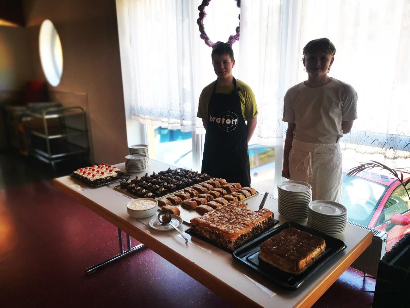 Es war für die SchülerInnen schon eine Herausforderung, immerhin benötigten wir ca. 160 Portionen, doch es hat sich gelohnt! Die Kuchen gab es dann nämlich als Nachtisch im Speisesaal für alle am Buffet zum Aussuchen. Manche hatten die „Qual der Wahl“, denn alle Kuchen sahen superlecker aus.