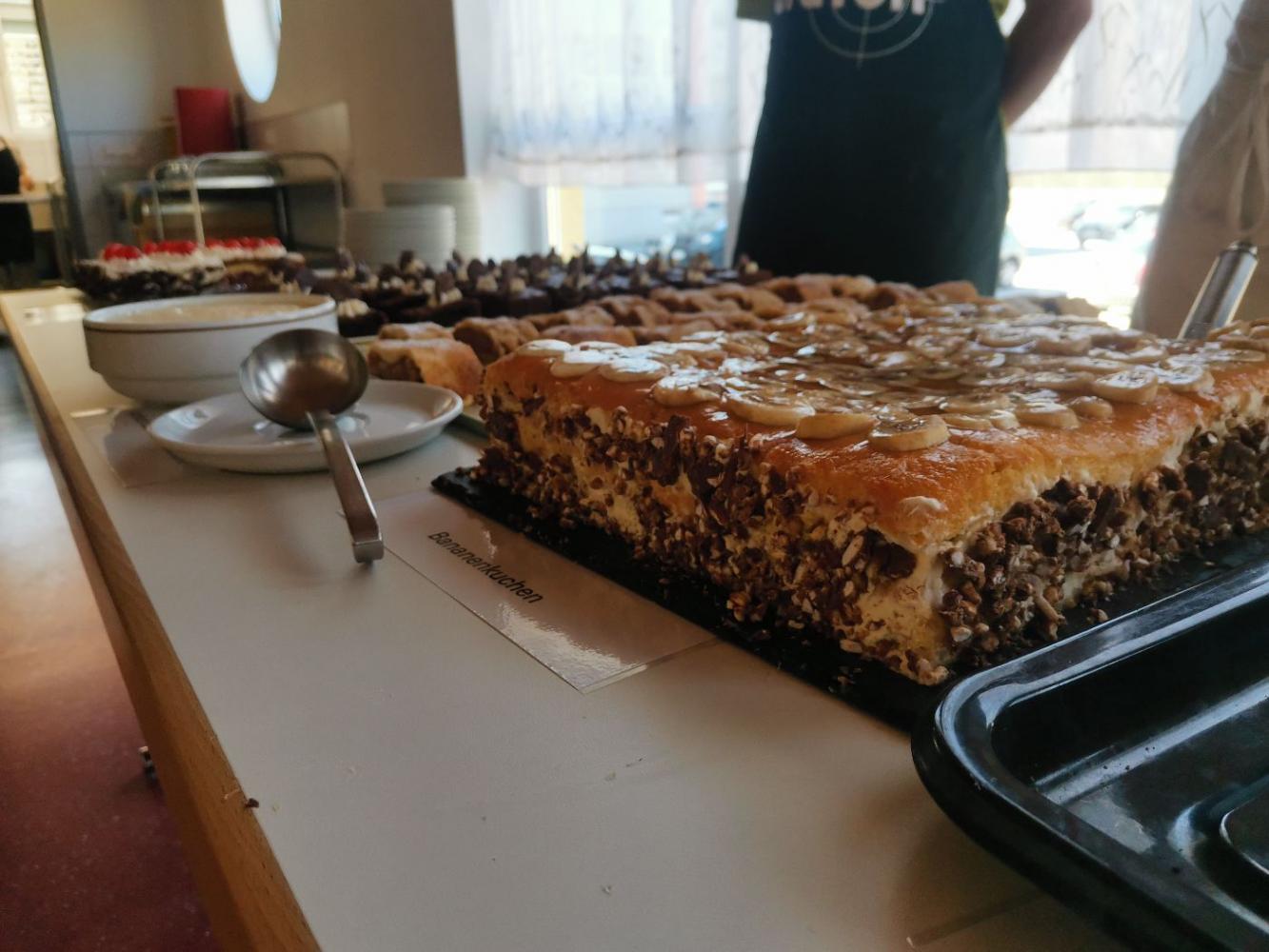 Gebacken wurde nach verschiedenen Rezepten, es war für jeden Geschmack etwas dabei. So konnte man wählen zwischen einem Bananenkuchen, Schokoladeschnitten oder einer Schwarzwälder Kirschtorte. Zudem gab es auch ein Tira mi su, selbstverständlich erfolgte die Zubereitung ohne Ei. Der typische Apfelstrudel durfte am Kuchenbuffet natürlich auch nicht fehlen, dazu gab es eine schöne Vanillesoße.