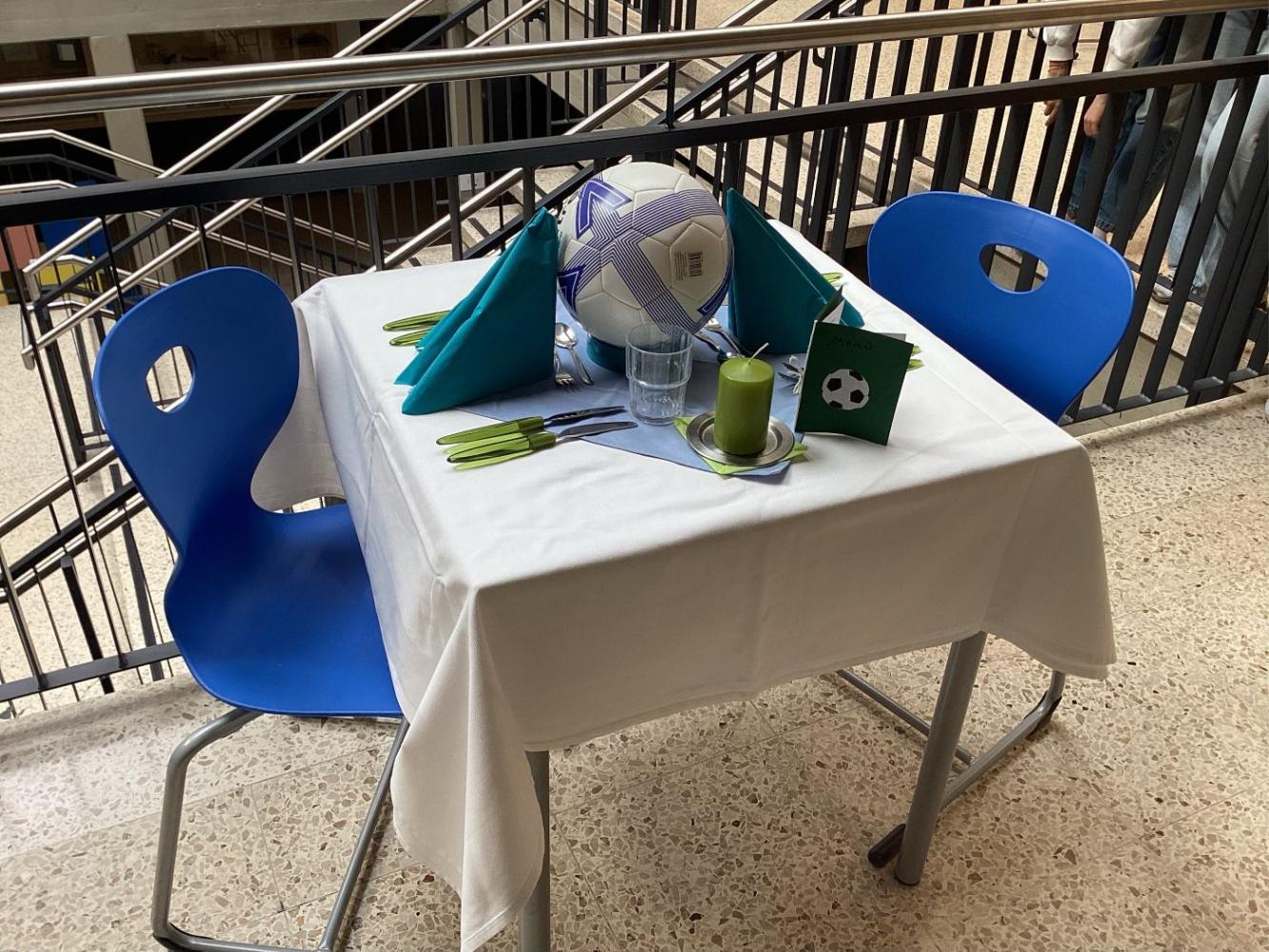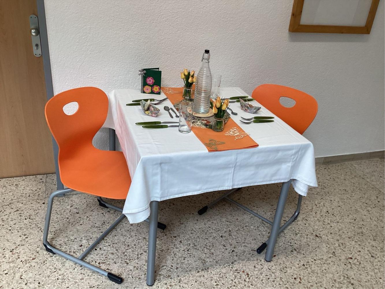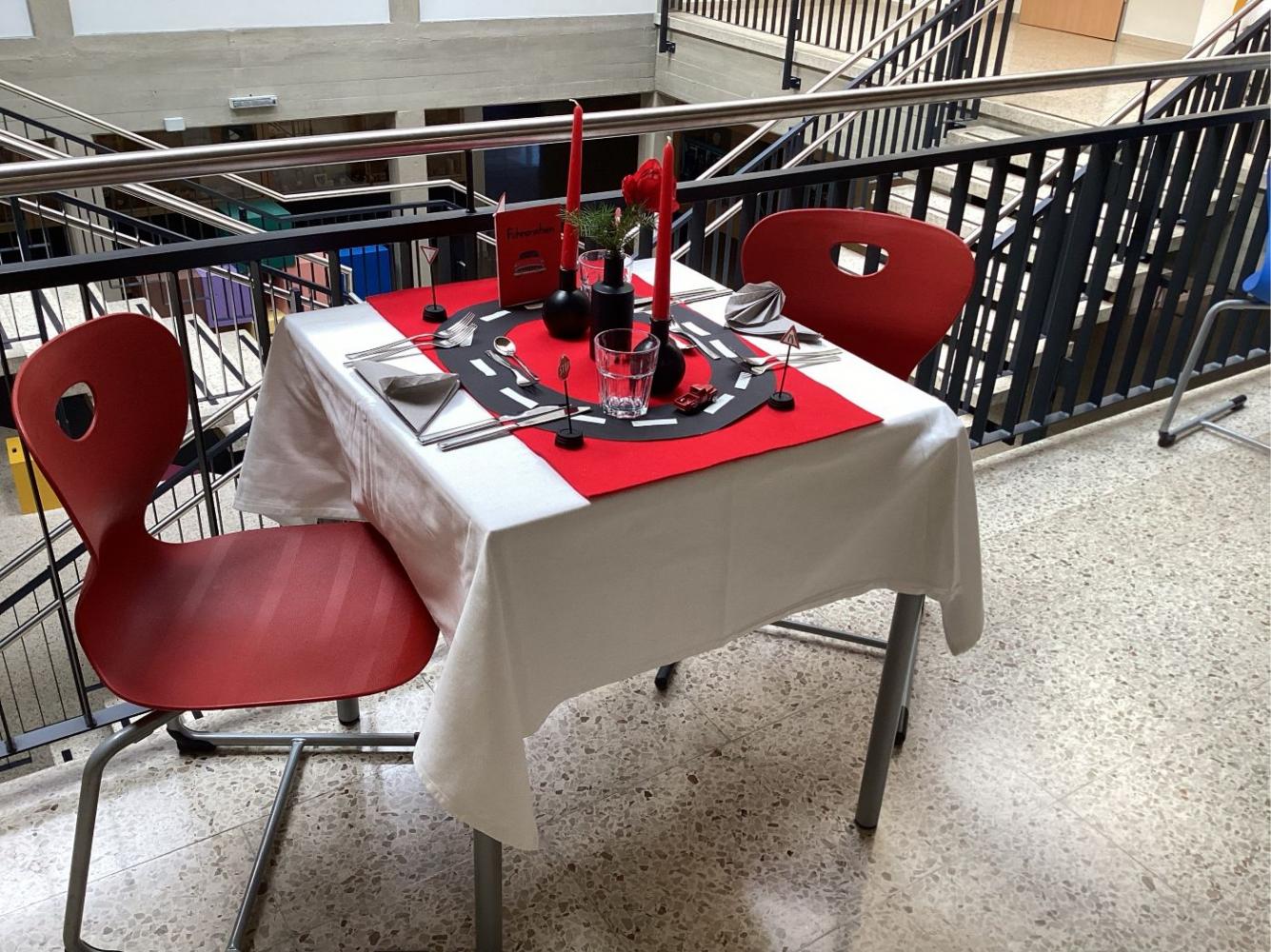 Die Schüler:innen der 4d konnten zu einem speziellen Anlass einen Tisch gestalten. Dazu gehörte auch das Falten der Servietten, das Gestalten der Menükarte und das fachgerechte Decken vom Besteck und der Gläser. Als Blickfang war ein Tischschmuck für die Tischmitte anzufertigen.